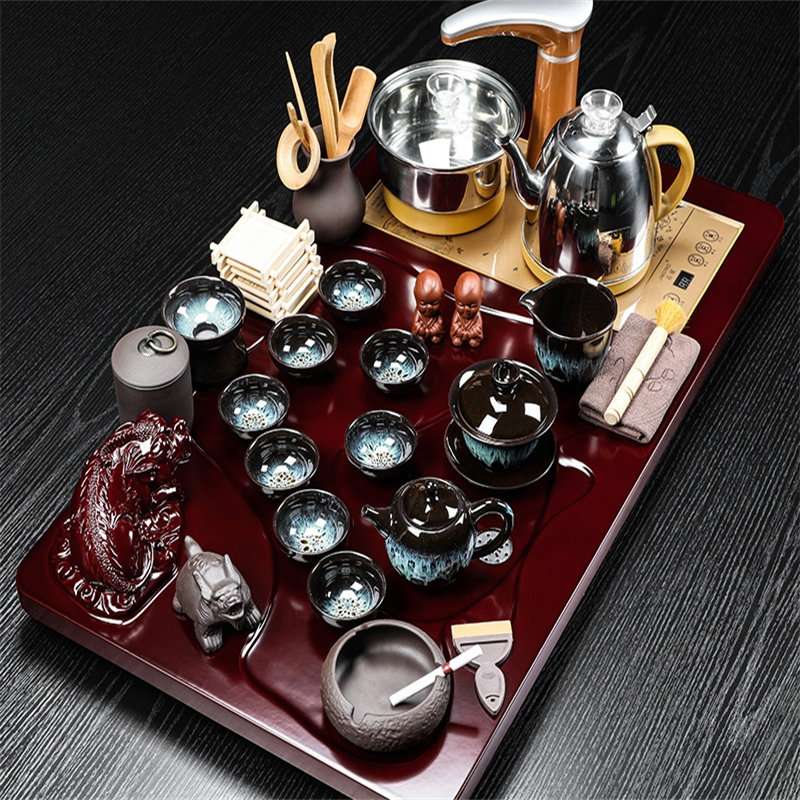 The Tea service set with tray is crafted to meet the needs of tea enthusiasts, providing all the essential tools for an authentic Gongfu tea ceremony. The set comes with a teapot, tea cups, fair cup, gaiwan, and several other essential tea accessories, making it ideal for both novice and experienced tea practitioners. With the thoughtful inclusion of the red wooden tea tray, you have a beautiful, functional surface for your ceremony.