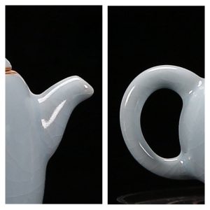 The defining feature of this teapot is its beautiful ice crackle finish, which creates a stunning, textured surface resembling delicate cracks in the ice. The light blue glaze contrasts beautifully with the subtle crackling effect, making each teapot unique. This intricate design adds sophistication and visual appeal to the teapot, creating a conversation starter for your next tea gathering. The porcelain material ensures that the teapot is durable while maintaining its elegant look. Pair it with our Chinese ceramic teapot collection for a complete aesthetic.