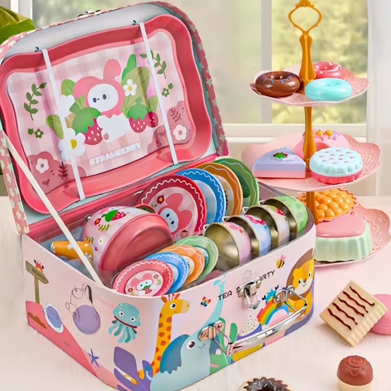 This tea set features a rabbit and strawberry theme, with adorable rabbit designs and vibrant strawberry accents, making it perfect for girls who love both cute characters and sweet treats. The three-tier dessert stand is an especially charming feature, allowing children to pretend they are serving delicious snacks and desserts to their friends. With a mix of bright colors and whimsical details, this set will become a favorite for any tea party.