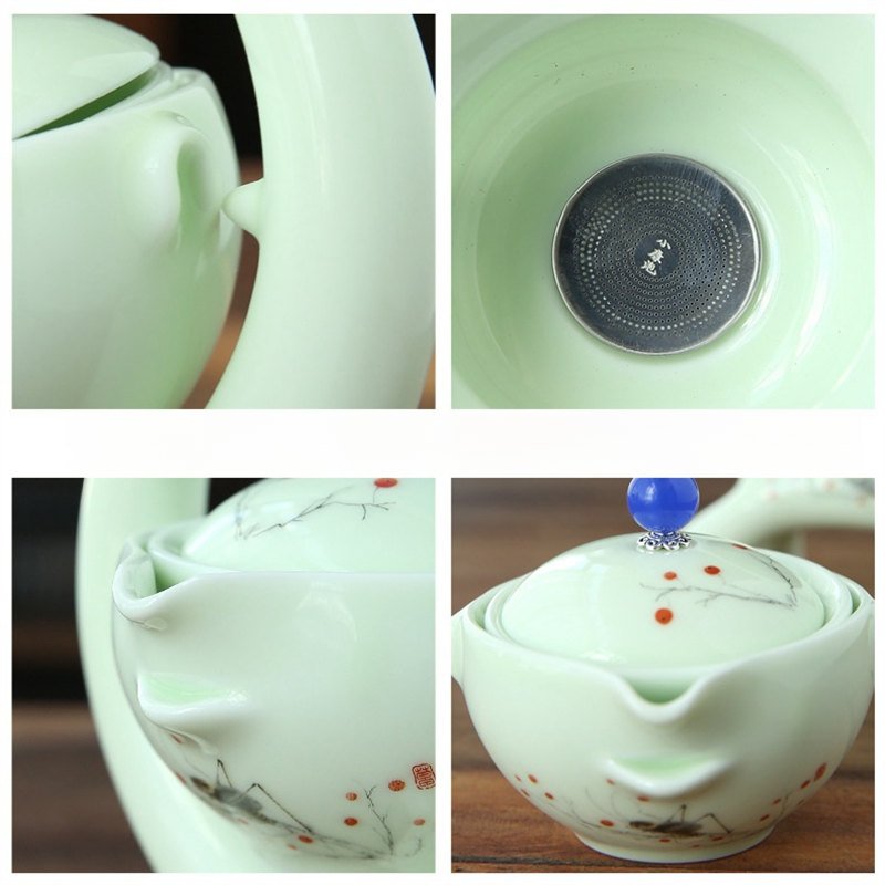 Crafted from high-quality porcelain, this tea set boasts both beauty and durability. The celadon green glaze not only enhances the aesthetic appeal of the set but also helps retain heat, keeping your tea warm for longer periods. The sleek, smooth surface of the teapot and cups ensures that each sip is as pleasant as the last. For another durable and elegant option, check out our borosilicate glass teapot, which offers a clear and modern design.