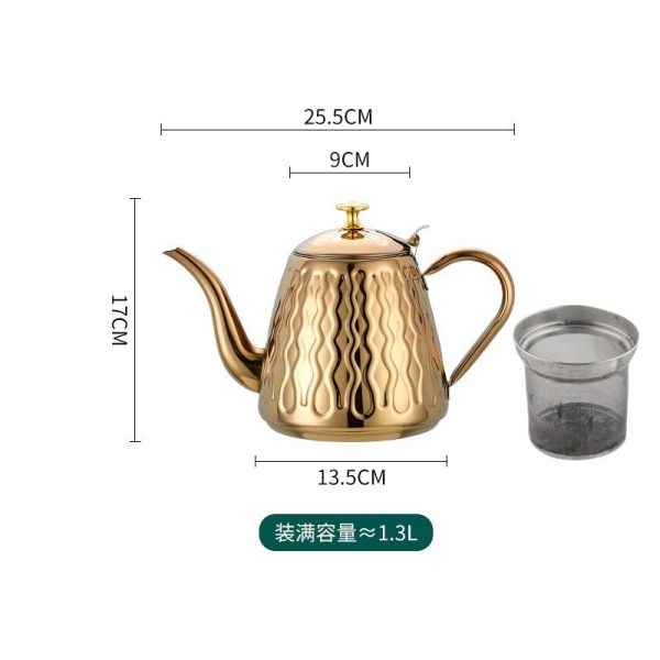 The Small Retro Golden and Silver Color Options Waves Premium Stainless Steel Gooseneck Teapot blends timeless beauty with modern performance. Its elegant wave-patterned finish, available in both golden and silver tones, adds sophistication to your tea brewing experience. The teapot’s vintage-inspired design is both eye-catching and functional, making it a perfect addition to any tea lover’s collection. For a similar design with greater pouring precision, explore the Gooseneck Teapot for superior control when brewing delicate teas.