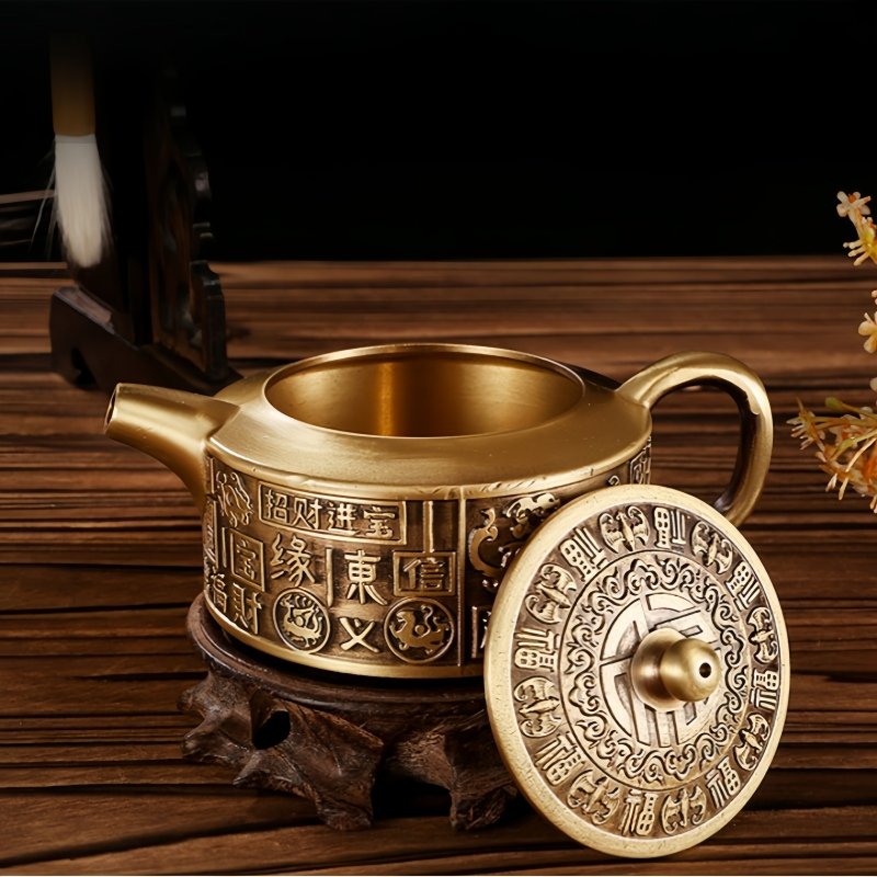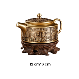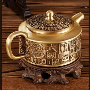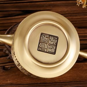 The teapot’s surface is adorned with traditional Chinese characters, skillfully carved into the brass body. These inscriptions, often associated with good fortune, prosperity, and longevity, make the teapot not just a functional piece of tea ware but also a symbolic treasure. The characters reflect deep cultural meanings, enhancing the overall value and significance of the teapot.