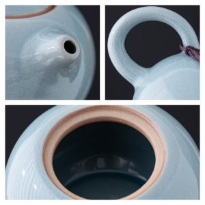 The teapot’s surface is adorned with a distinctive blue ice crackle glaze, a hallmark of celadon ceramics. Its unique texture and smooth finish evoke the beauty of frost on glass, making it an elegant complement to your ancient Chinese teapot collection or Chinese tea ceremony set.