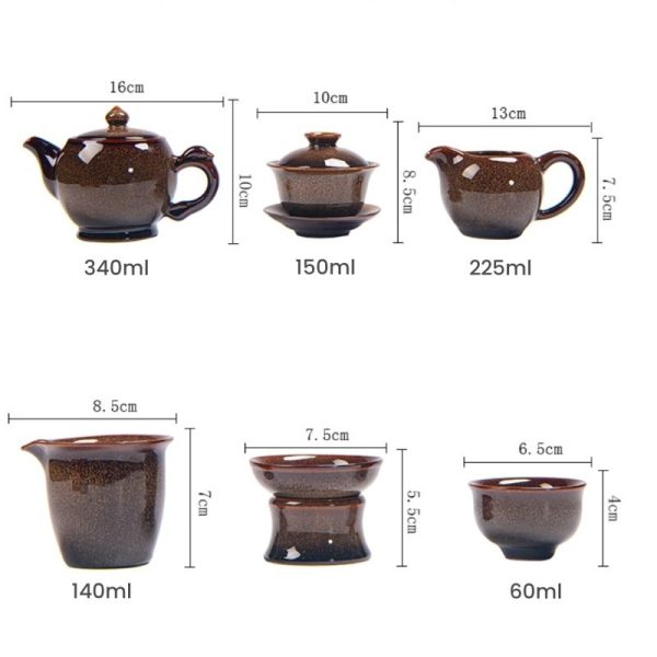 The Jun kiln pottery used in this set is renowned for its fine craftsmanship. The tea set’s unique brown ceramic glaze is achieved through traditional kiln firing techniques, giving each piece a distinctive crackled finish that enhances its visual appeal. Whether you’re using it for a traditional tea ceremony or displaying it as part of your collection, this set brings elegance to any occasion. The set’s design is reminiscent of Chinese teapot set designs, making it an excellent choice for tea enthusiasts who appreciate both beauty and tradition.