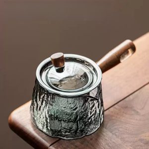 The Transparent Grey Glass Strainer Teapot with Side Wooden Handle and Loose Leaf Infusers combines modern functionality with an elegant, minimalistic design. The transparent grey glass body allows you to observe the tea’s color and infusion process, making it ideal for those who enjoy the art of tea brewing. The design is sleek and modern, perfect for showcasing your favorite loose-leaf teas. Whether you’re brewing green, black, or herbal tea, this teapot ensures you get the full flavor from your leaves. It pairs beautifully with a borosilicate glass teapot for those who love quality craftsmanship.