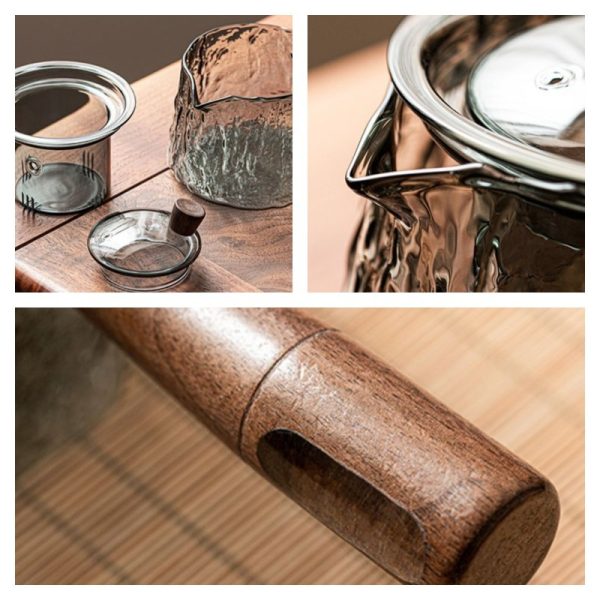 One of the standout features of this teapot is its side wooden handle, which not only provides an attractive, natural contrast to the grey glass but also allows for a comfortable grip. The ergonomic design ensures a secure and controlled pour, reducing the risk of spills or burns. Whether you’re pouring tea for one or serving guests, the handle’s ergonomic design guarantees ease of use. The wooden handle adds a rustic charm, making this teapot the perfect addition to any kitchen or tea collection. For even more tea enjoyment, you might consider pairing it with a ceramic tea mug with infuser and lid.