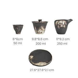 Each piece in this set is handmade, showcasing expert craftsmanship that highlights the unique textures and natural patterns of the lotus pod. The set includes a gaiwan, tea cups, a fair cup, and a tea tray, all designed with organic shapes and rough pottery textures that enhance the overall vintage feel. The elegant lotus pod motif is featured prominently across the pieces, adding a touch of nature-inspired beauty to your tea ceremony.