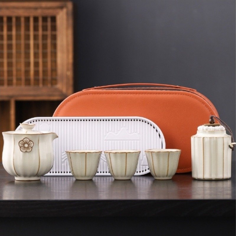 The Vertical Stripes Beige Porcelain Portable Gongfu Travelling Tea Set Case with Caddy combines elegant porcelain craftsmanship with a convenient travel case, offering everything you need for a traditional Gongfu tea ceremony on the go.