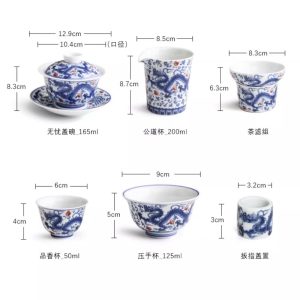 The Chinese tea cup design of this set is both practical and artistic, featuring beautifully detailed blue and red dragons intertwined with phoenix imagery. Each tea cup holds just the right amount of tea for a perfect sip, ensuring that the flavors are concentrated and enhanced. Whether you’re a seasoned tea drinker or a beginner, these cups will elevate your tea experience, making it a special moment each time you indulge.