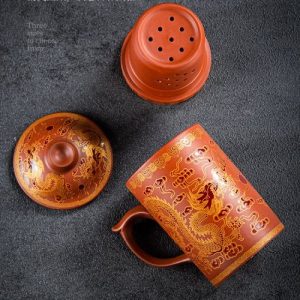 The Vintage Hand-painted Dragon Yixing Purple Clay Tea Cup Mug with Infuser is a stunning blend of traditional craftsmanship and elegant design. This tea cup is made from high-quality Yixing purple clay, which is renowned for its ability to retain heat and enhance the flavor of your tea. The intricate hand-painted dragon design on the exterior adds a touch of sophistication and cultural significance, making it a perfect addition to your tea collection.