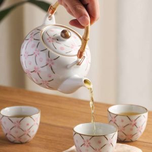 The teapot features a beautifully woven bamboo handle, adding both functionality and style. Bamboo provides an ergonomic grip for easy and comfortable pouring, making it easier to serve tea to friends and family. The natural tones of the bamboo contrast beautifully with the white porcelain, enhancing the overall aesthetic of the set. The bamboo handle is not just practical but also gives the teapot a rustic, earthy charm that complements the delicate Sakura design.