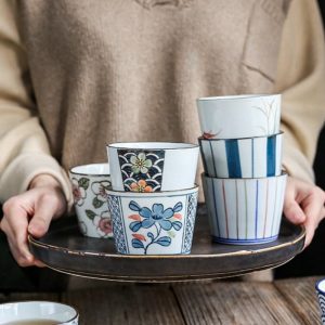 The Vintage Imariyaki tea cups feature five distinct hand-painted patterns: Sea, Cherry Blossoms, Japanese Fabric, Stripes, and Flowers. Each pattern tells its own story, reflecting elements of nature and culture. The Sea motif is inspired by the vastness and tranquility of the ocean, while the Cherry Blossoms design captures the fleeting beauty of Japan’s iconic springtime blooms. The Japanese porcelain tea set motif celebrates Japan’s rich fabric history, while the Stripes and Flowers patterns offer a more contemporary yet equally elegant touch. These varied designs ensure that each cup is distinct and provides a unique aesthetic experience.