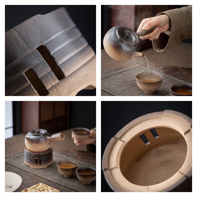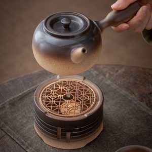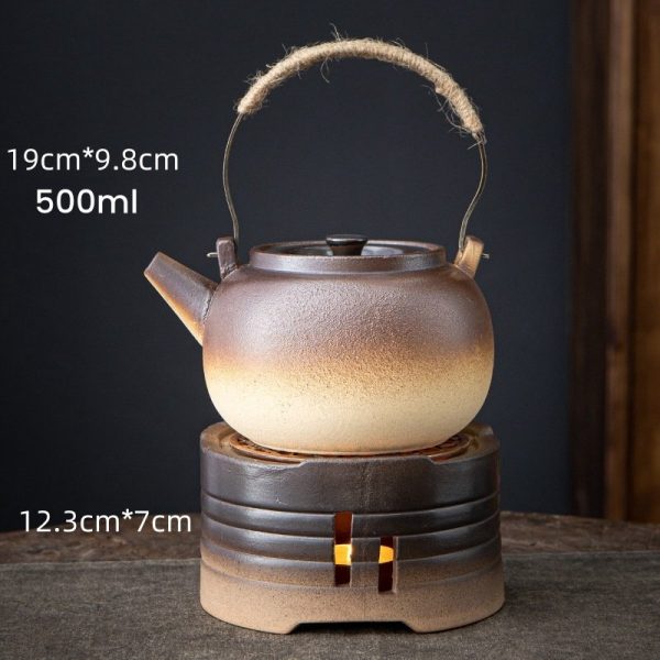 The Vintage Rough Pottery Teapot with Side Handle and Tea Light Wax Candle Warmer Holder combines rustic artistry and functionality, offering a traditional way to brew and serve tea while keeping it warm.