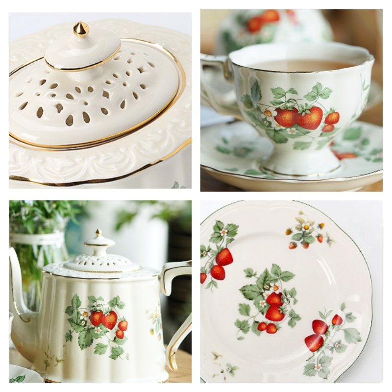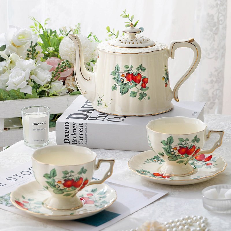 This Vintage Strawberry Fields Fine Bone China Tea and Coffee Set is designed for both tea and coffee lovers. The teapot, cups, and saucers are all thoughtfully sized, providing just the right portions for a cozy tea party or a casual coffee break. The elegant design ensures that this set will impress your guests, adding a charming and sophisticated touch to your gatherings. Each cup is designed to fit comfortably in your hand, making it ideal for long, relaxed tea sessions.