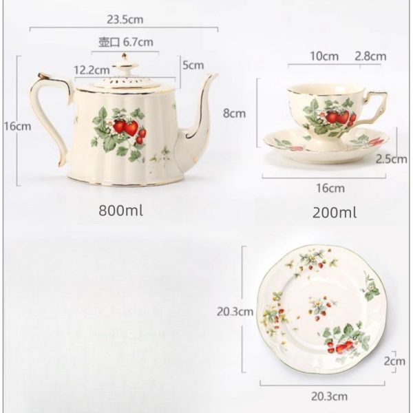 Indulge in a charming tea experience with the Vintage Strawberry Fields Fine Bone China Porcelain Tea and Coffee Set. This delicate and beautiful set brings together classic design and premium craftsmanship, making it the perfect choice for tea and coffee lovers alike. Featuring intricate illustrations of fresh strawberries paired with lush greenery, the set captures the essence of a quaint, countryside garden. The fine bone china material ensures durability and a smooth, glossy finish that enhances the overall elegance of the set.