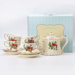 Crafted from premium fine bone china, this set offers a perfect blend of durability and delicacy. Bone china is known for its strength and translucent quality, making it a popular choice for high-end tea sets. The lightweight yet sturdy cups, teapot, and saucers retain heat well, keeping your beverages at the perfect temperature for longer periods. Whether you’re enjoying a cup of tea or coffee, this set enhances your experience with its elegant and practical design.