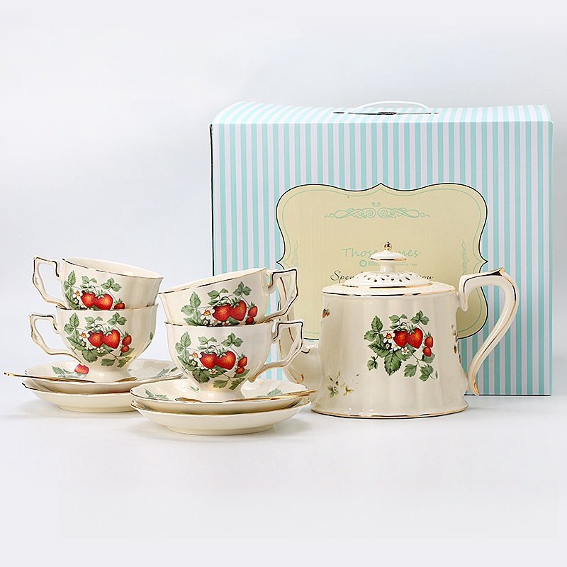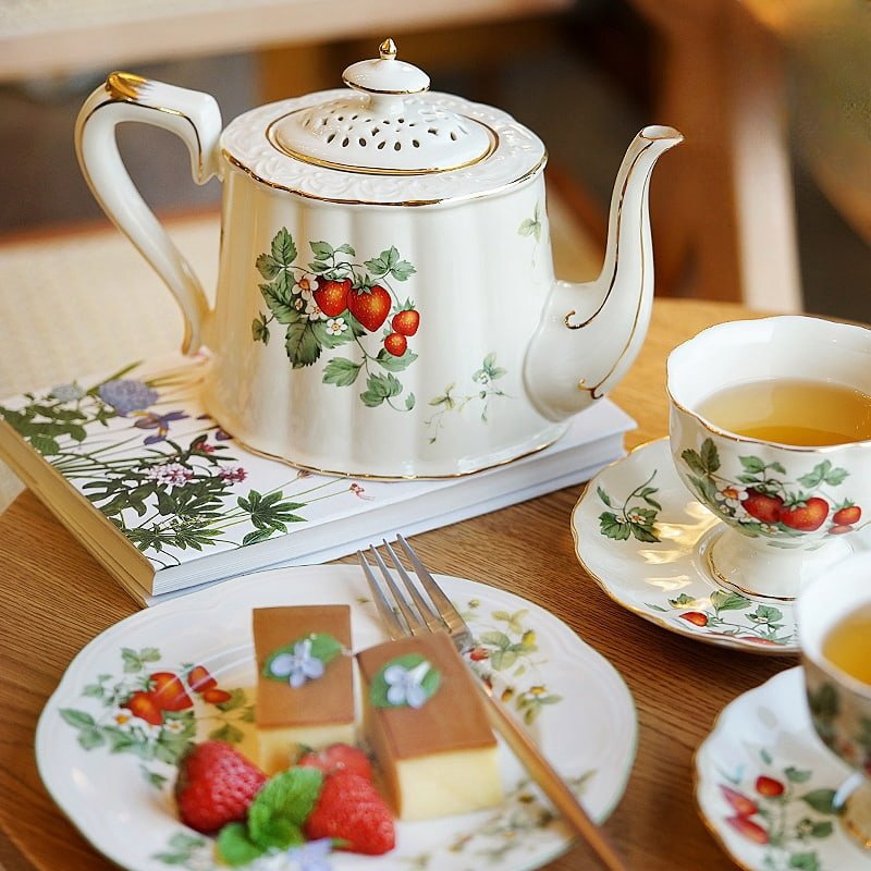 The standout feature of this tea and coffee set is its timeless strawberry fields design. The soft cream-colored porcelain is adorned with bright red strawberries and vivid green leaves, creating a refreshing, natural look. The design brings a touch of nature into your tea time, evoking a sense of warmth and nostalgia. With gold detailing on the edges of the cups, teapot, and plates, the set exudes a refined elegance, making it an ideal addition to your collection or a thoughtful gift for loved ones.