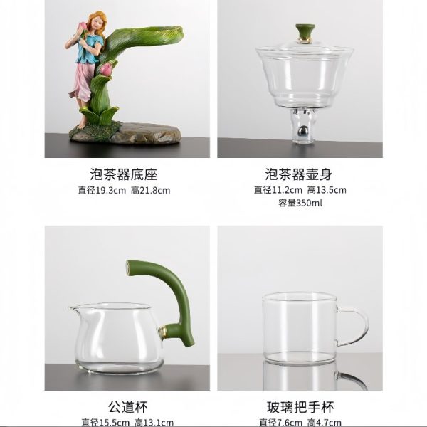 The Wizard of Oz Theme Elegant Green Semi-Auto Lazy Kung Fu Glass Tea Set blends a whimsical flower fairy design with a semi-automatic pouring system and durable glass construction, making it ideal for elegant tea ceremonies.